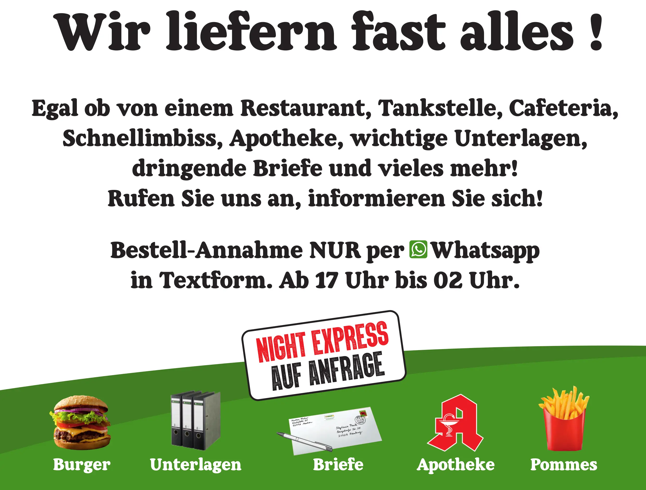 Wir liefern Burger, Unterlagen, Briefe, Medikamente, Pommes.